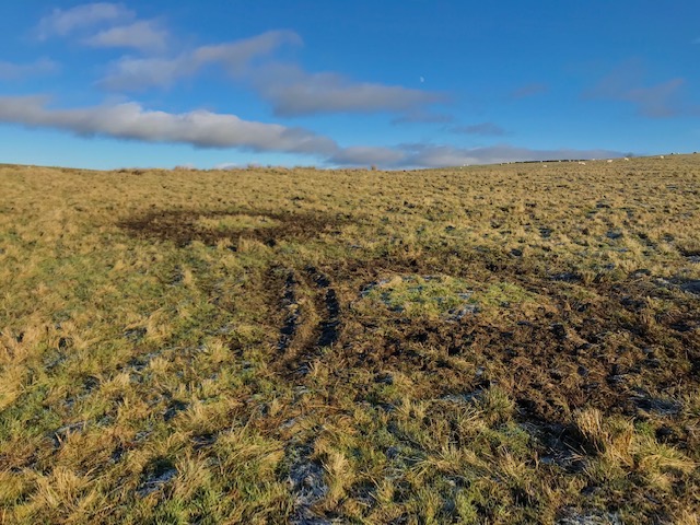 Our farming neighbours too have no option but to be out and about, whatever the weather. Through the days of snow and then constant rain Southridge’s tractor has delivered round bales of hay to each and every ring feeder. They also rotate the metal frames to avoid the wear and tear of a flock’s hoof marks. Stock poached ground, when seen in isolation, puts me in mind of crop circles and UFOs.
