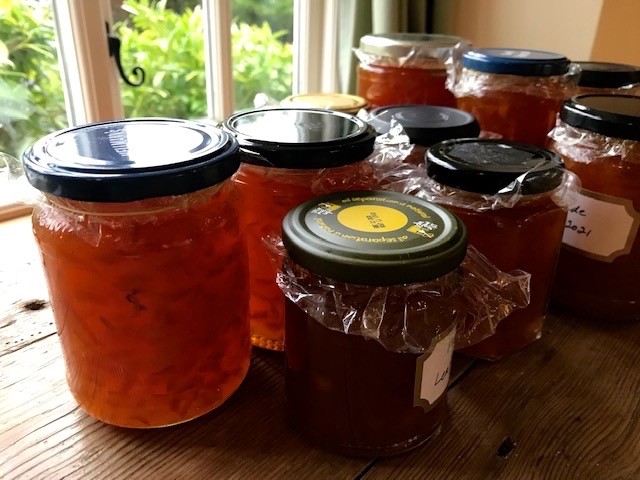 The annual marmalade making was last month’s culinary highlight. Seville oranges import a touch of far away sun into the kitchen and two extra lemons in the mix gives it the 2021 taste. Previous years keynotes have included black treacle and whisky. Usually our visitors depart with a pot at the end of their stay so currently we have a year’s backlog to get through (or prepare for a giveaway bonanza) when things are back to something like normal.