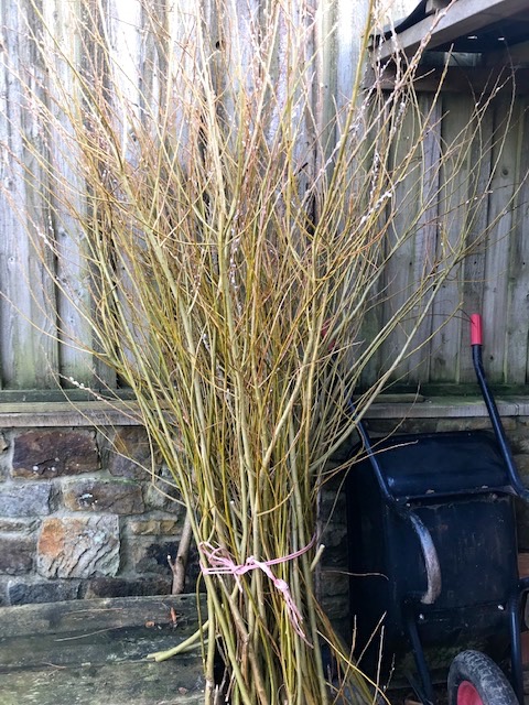 Five years ago friends in north Devon allowed us to cut some whips from coloured willow they’d planted in the wet end of a field newly planted as an orchard for their juice making business. They took well here in Northumberland and every year we harvest from them to make wreaths and stars or give to our crafting neighbour for her flower arrangement business. Here’s this spring’s bunch, tied in the yard, waiting collection.