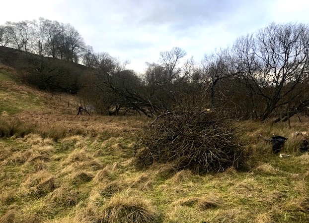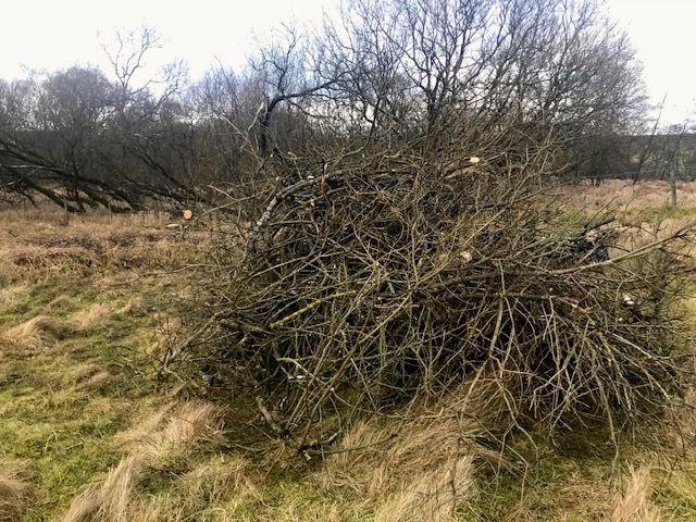 My good mate Dave & I have returned to the bottom of our four acre patch of rough grazing to carry on where we left off before the snow came. We traced the barbed wire in the wreck of dead grass and sedge and set up half dozen new fence posts. The soggy ground quaked but received them well. I wore out a pair of padded gloves straightening & pulling the vicious metal strands to get stapled to the posts. This ‘pole and barb’ will keep cattle, as well as sheep, away from the fence dented by the sagging trunks of our northern neighbour’s willows that we had previously trimmed or felled. My friend is accurate and suitably safety conscious with the deadly saw as he goes about his work and we soon have a high pile of branches and logs for a future bonfire. Willow’s not a wood that burns well, being steeped in damp, but once dried it should light with artificial combustible help.