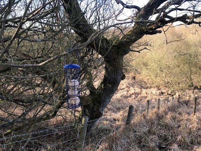 Further to my last post on 1st March I put two types of bird feeder at our field end, on our northern neighbours overhanging willow branches. The hope was to see if endangered species of willow or marsh tit might be present in this type of environment, and if so, might they be attracted by this food. Daily visits reveal the fat balls are a hit but the Niger seeds are not. No sign of marsh or willow tits alas but we’re well compensated by the sight of a flock of pretty long tailed tits enjoying the feast. Insectivores, they are clearly also partial to fat balls. Until this point I had seen more of these endearing creatures stopping off at the feeder in the yard of my terraced home in Lancaster than I had here in the rural heart of Northumberland. Rick Thompson in his delightful book Parklife, A Year in the Wildlife of an Urban Park, memorably describes a long tailed tit as being like a ball of wool with the knitting needles sticking out.