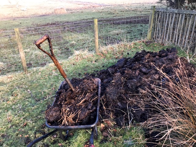 After a clean out of their stable Southridge gifted us a digger bucketload of horse manure & straw over our boundary fence. I’ve been commuting back and forth with the wheelbarrow ever since; spreading it on flower beds, round fruit trees and bushes, topping pots and bolstering compost boxes. With the Spring offensive under way at last we’re increasingly involved in garden renewal and maintenance…Winter’s nature friendly dead foliage is cleared, some frost killed shrubs dug up and replaced with other more hardier varieties. The pond, I’m cheered to note, is stirring to life as yellow globe flower heads swell and floating strands of veronica leaves green up.
