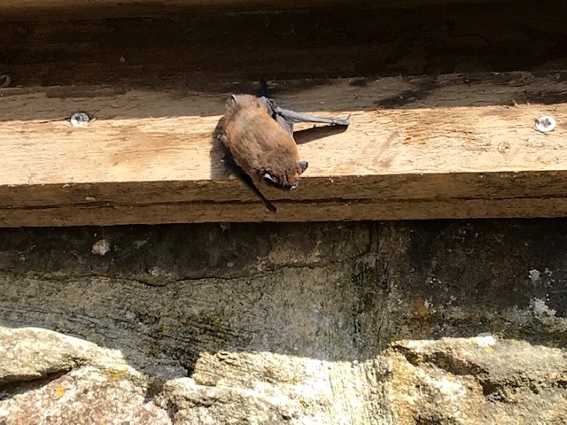 Sitting out in the open sided porch in the good weather phase we were startled by the sudden appearance of a bat – a common pipistrelle as it turned out – awake from hibernation in a thumb width gap between porch roof beam and stonewall.