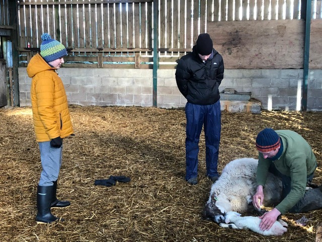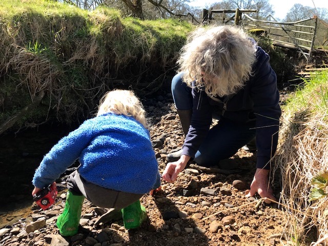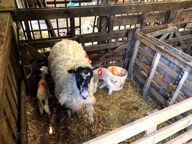 A combined family walk over at Hazelford a few days later on a fine sunny afternoon is good for us all in different ways. We’re shown where the orphaned or rejected lambs are ‘put to’ adoptive ewes, penned by bales and hurdles in the lower barn, until the smell and presence bonds them (or not as the case may be).