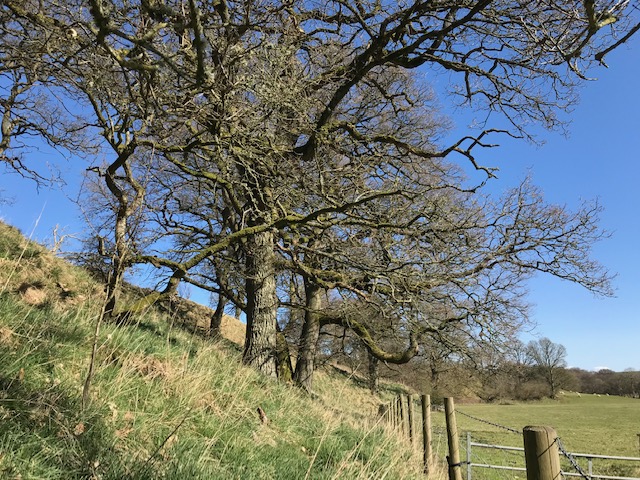 Further off I admire the mature trees, mainly oaks, along the steep bank that defines the northern edge of meadow. These are remnants of ancient woodland (officially defined as being at least 400 years old). Now protected by fencing, up until 40 years ago when our friends tenure started, it was still being felled for timber. Today an understory of hazel gleams in the sun, hawthorns are shortly to burst into leaf while grey discarded boughs gently rot on the ground below the giants that shed them. Fencing doesn’t stop deer predating oak saplings while summer’s rampant grasses and weeds will likely choke them. Our friends are planting oaks from home grown acorns as and where they can.