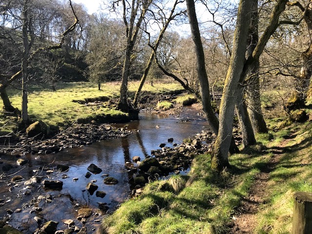 I peel off track from time to time to take in the lie of the little valley. Star bursts of spring flowers in the banks; free mingling celandines, primroses, violets and wild strawberry enriching the vision with their delicate colour mix. Alders, willows and ash define the river along its boundary banks.