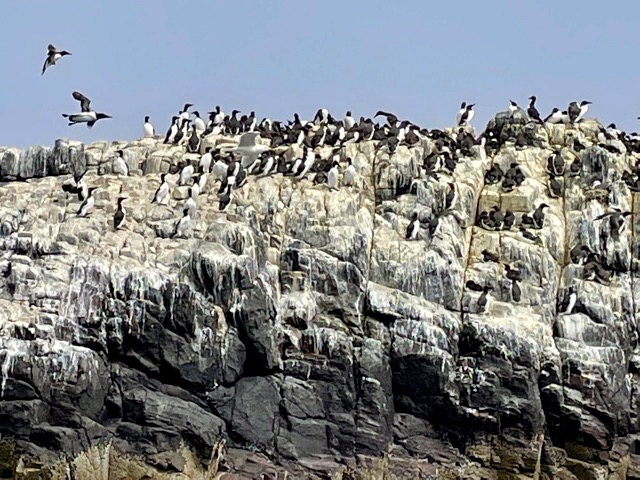 Our voyage round the island group took in (amongst other highlights) the UK’s largest colony of breeding Atlantic grey seals and close up views of the guano covered mini-cliff faces where vast numbers of guillemots outstrip the other seabirds who nest there. Along with razorbills, terns, puffins, eider they raise an acrid smell as pungent and impressive as the sight of them wheeling, slicing, diving and gliding all around us. It was disappointing this mist wrapped morning only gave limited visibility yet at the same time the restriction made for an experience as powerfully eerie and atmospheric as any ghost story.