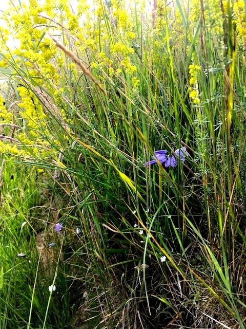Particularly love the lavender blue flowers of the harebell. Their numbers have definitely increased along the dry poor soil margins where deep but narrow ditch meets lush grass verge. Likewise, there’s seems to be more lesser stitchwort about as they like dry meadows and grassy places too. As the name implies the folk medicine canon had a place for it as relief from the pain of a stitch. Surprised to learn that the pretty white flowers only last three days. Luckily, the plant is a prolific producer through the summer months. The delicate looking flowers (only five petals but heavily indented so appear as ten) float serenely above the ditch, reinforcing its star like imagery. Most obvious though is the frothy yellow presence of ladies bedstraw, which is another coloniser of the mini-cliff face here. A hardy perennial of grassland it gives off a subtle scent somewhere between honey and hay. Traditionally the plant was used to strew floors and stuff mattresses, as its astringent qualities deterred fleas and was thought to aid safe delivery for women in childbirth. The dense clusters of tiny yellow flowers were used in cheese making apparently as a coagulate of milk and that the original Double Gloucester owes its rich colouring to the plant!
