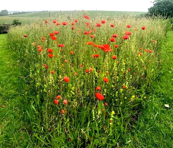 Exactly a year ago our garden meadow was radiant with red poppies. This year there’s ne’er a one but instead it’s bursting with marguerite daisies. Such unexpected succession planting, with different germination patterns playing out, makes for constant interest. What will dominate, or appear for the first time, next year? We’ve never had so many yellowrattle flowering before as we have this year and that should affect future grass fertility as they seed and spread.