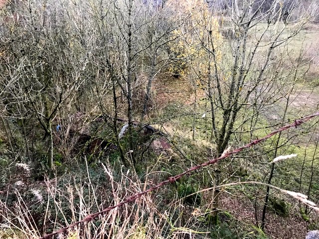 Sycamores and sizeable berry laden hawthorns dot the farmland hereabouts. The imposing mature trees of the sheltered valley woodlands are still sporting leaves of flame, russet and gold but these hardy exposed trees have been stripped of their remaining foliage by autumn gales. The grey dry stone field walls at their feet are nearly all tumbledown and serve no purpose other than to mark former boundaries where now cattle and sheep range at will.