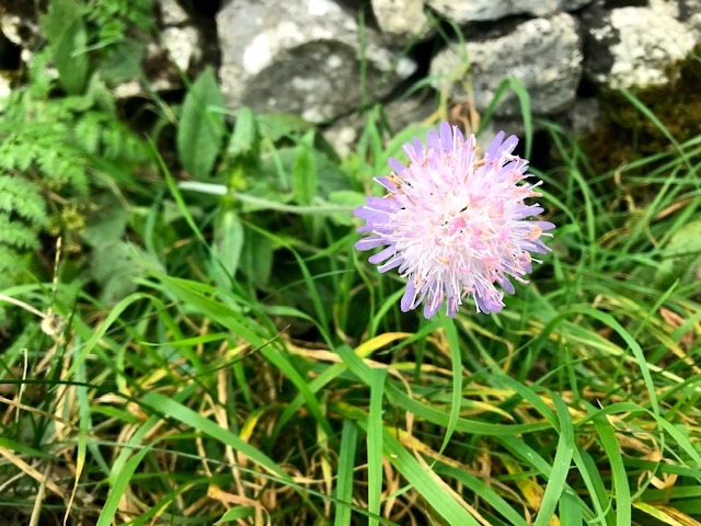 Another walk, but this time we’re strolling in the opposite direction with clear weather views of fells and yet another quarry, hillside fields and patchwork of valley woods. The lane’s tarmac gives way to rock and mud then rutted grass track between maintained stone walls. I smile at the sight of a washed out lilac coloured scabious flowers (lover of limestone soils) holding on in the narrow grass verge.