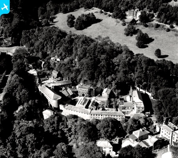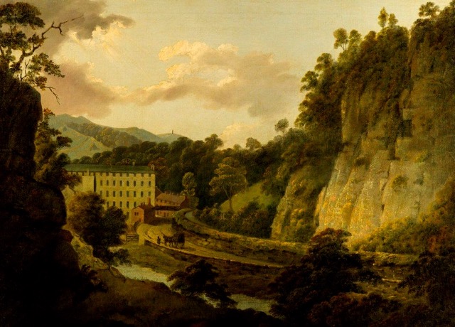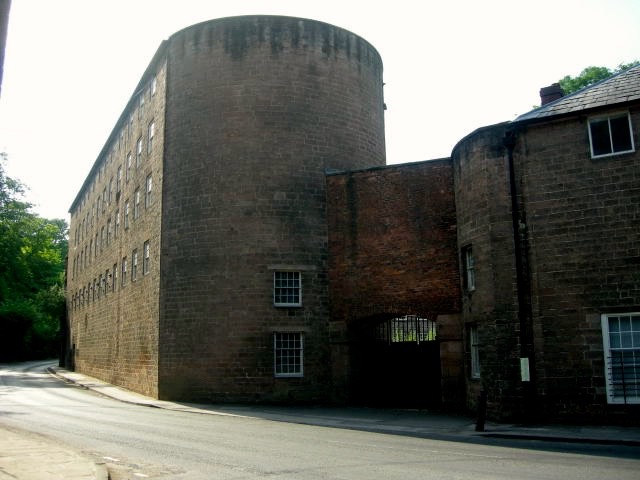 So successful was this first mill that a second larger mill, together with extensive warehousing, were soon added. In design the works were now resembling a medieval castle, with a sheer cliff face topped by a wooded eminence – Scarthin Rock – completing the site’s fourth ‘wall’. Any resemblance was intentional. The great industrialist, keen to keep out unwanted attention from competitors, also maintained a cadre of apprentices housed in a barrack like communal building (since destroyed by fire), and they acted as a resident security and oversight force. Given that, in the years that followed, rioting handloom weavers would storm these new factories to destroy the hated machines that had left them jobless and destitute, Arkwright’s astuteness in adopting a defensive design was apt.