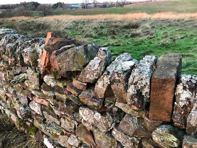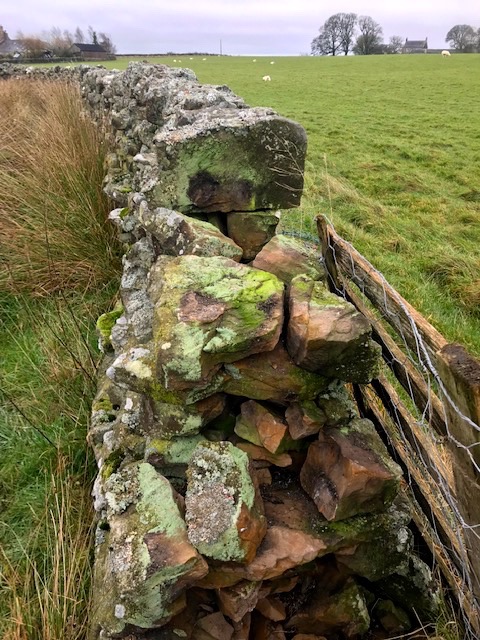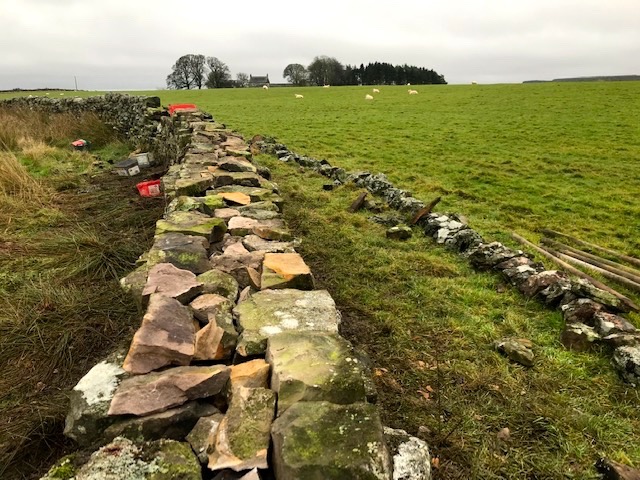 The middle section, which Jonny marks out at 50 strides, had worsened since I last walked it with him in the summer. He and younger brother Ben had a lot of work on in our region, and beyond, so we’ve had to patiently wait our turn. They finally rocked up in their 4X4 this back end, working solidly, dawn to dusk over a few weeks in testing weather before and after Storm Arwen. They methodically dismantled, sorted, laid out and reassembled the multi-sized grades of sandstone, supplemented with the odd lump of hard and heavy dolerite whinstone.