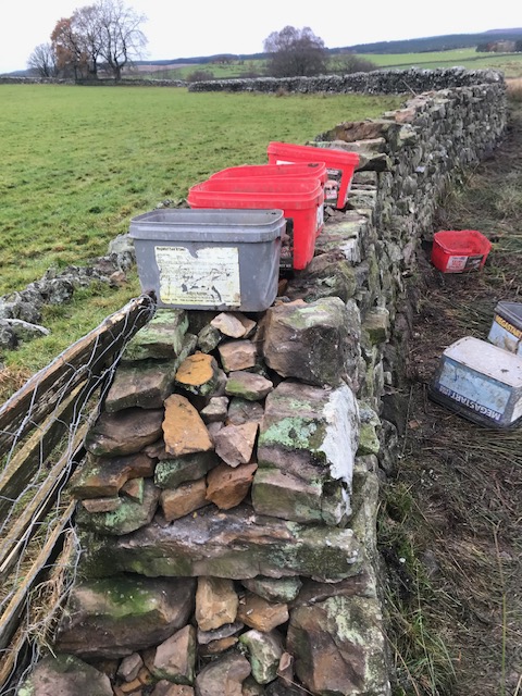 Both wear goggles and gloves. Jonny says he’d previously ended up in hospital A&E with flakes of stone chips in his eyes so sees the need to always wear PPE. They use a stash of plastic tubs that formerly held ovine mineral licks to store the smallest stones or ‘fill’. This they pack in between the outer facing stones that many wallers call ‘heart’ but which they term ‘middle’. The walls in our district are mostly constructed from locally quarried sandstone. Jonny points with some pride at a distant field wall – his first job when starting out as a lad some 25 years ago.