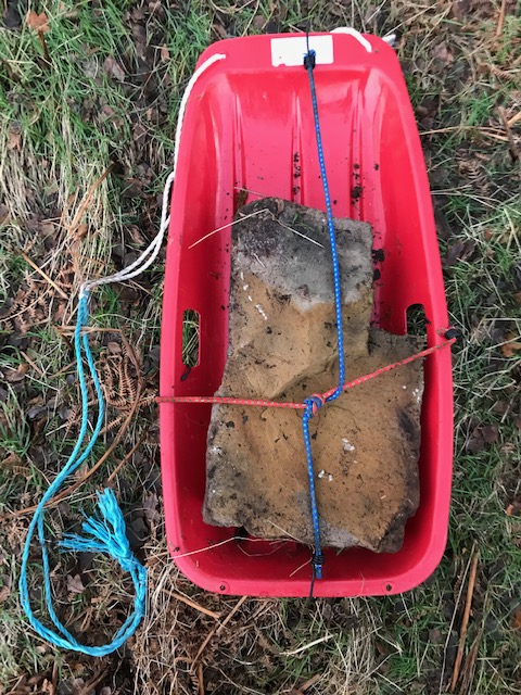 I volunteered to help as apprentice, or rather, their goffer. We’re still short of material to finish the stretch so my task is to retrieve as many stones as possible from the remains of our field end wall, long since replaced with fencing, pole and barb. The grass covered mound is situated on the field’s steepest slope so I’m using the kids red plastic sledge to transport the recovered haul up to a gate where the boys can drive down later to load up. I labour slowly to flip any wide big slabs excavated up the grassy incline on to the flat. They’re invaluable as through stones, helping to stabilise and keep the structure tight.
