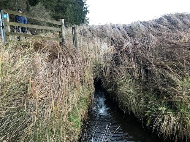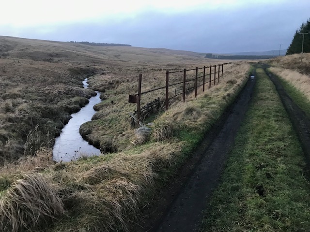 I take an amused delight in straddling the rivulet as it emerges to gurgle down the gentle slope to the flat valley bottom. There we temporarily lose sight of it in the bog and tussocks either side the raised trackbed of a disused railway.