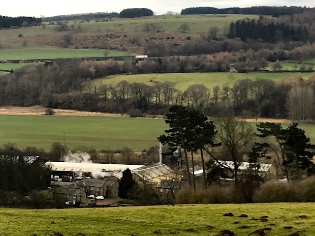 Did not divert to the summit on this occasion but instead continued with the gently descending track leading into the valley of the north Tyne, through the Warden estate and home farm with its outbuildings, paddocks, tied cottages, walled gardens and parkland. Lots of fallen trees in evidence and later, joining the valley road, saw more felled timber awaiting collection. A small yellow bulldozer and forwarder (trunk carrier) were parked in the ploughed up verges and field tracks. Later research revealed that, out of sight a few hundred yards up the steep slope, is the site of a motte and bailey castle. Just one of many ‘pop-up’ wooden forts built by colonising Normans in the late 11th Century. Like so many others it would eventually be abandoned, but the fact that it maintained the ‘watch hill’ function, here above the meeting of the waters, is significant in itself.