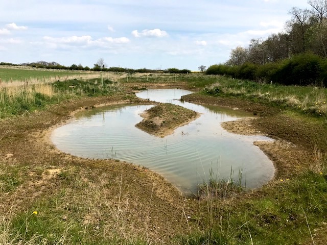 Skirt the new woodlands, edged with a fine line of cherries in glorious blossom, before crossing a verdant lane to learn more about the series of ponds scrapped out of blue clay bordering the farm’s biggest field, a south sloping former moor or ‘waste’ that was ‘improved’ in the 18th century. Those old field drains have now being blocked where found, helping re-wet the lower ground and reducing flooding danger on the adjacent road. Amazingly, this project was made possible by Coca-Cola Corporation who operate a bottling plant for Abbey Well spring water at nearby Morpeth. Corporate responsibility policy obliges them to help restore or otherwise enhance water resources in the area they extract from.