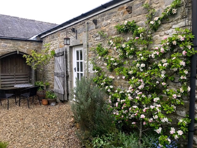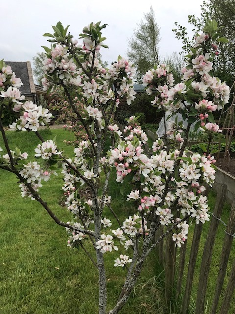 This year’s apple blossom has been exceptionally good. Frosts have not been a problem so far (fingers crossed) so setting for fruit has been good. Our south facing aspect greatly benefits the fruit trees espaliered on that side of the house – the stone gives shelter and retrains heat, and they thrive. The James Grieve for instance, the first variety we planted six years ago, has spread luxuriantly. The pear and apple trees re-planted in wooden pots two years ago – well fed, in good compost and mulched with bark – also thrive on that walled garden south side.