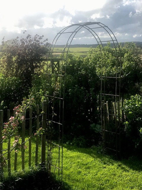 Last autumn the storm battered old wood gazebo collapsed and was replaced by a metal arch that has slowly rusted once exposed to the elements. Have now made it a pair by installing another at the other, lower, entrance to the vegetable garden. I’ve re-positioned a climbing Tayberry on one side and a thornless blackberry on the other. (Both of them failed to grow happily elsewhere). Here’s hoping they thrive as much as the New Dawn climbing rose and Blue Angel clematis do on the other arch.