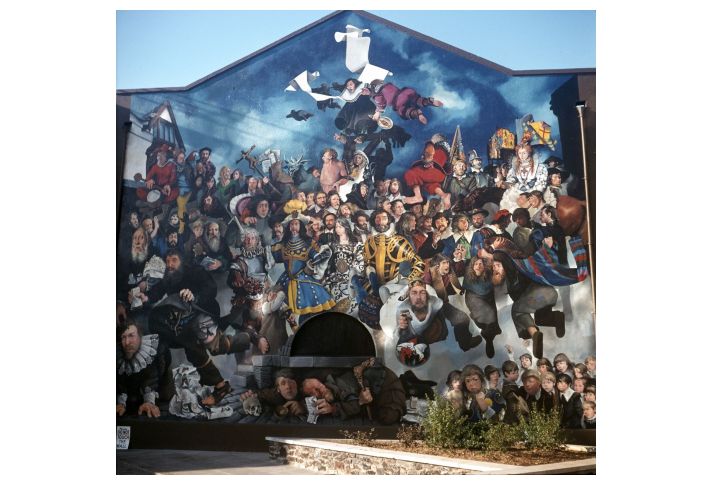 I’d recalled from my youth the astonishing mural produced by that other famous Barbican artist and resident, Robert Lenkiewicz (1941-2002). Eventually rediscovered his ‘Everyone is Welcome’ old studio and, on its end wall, the now ghosted and crumbling 300 square foot mural. Created with such verve 50 years ago, and fusing art and life in using local people as his models, it celebrates the metaphysics of the English Renaissance and the Barbican’s role as a dynamic mercantile powerhouse at that time c. 1580-1620. Here’s an online re-coloured version. More at: https://www.robertlenkiewicz.org/