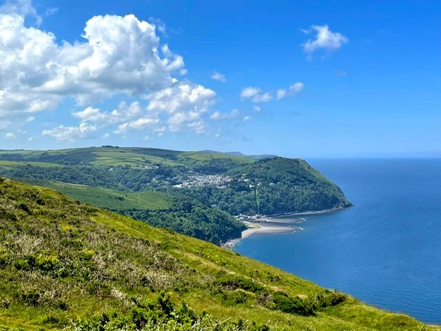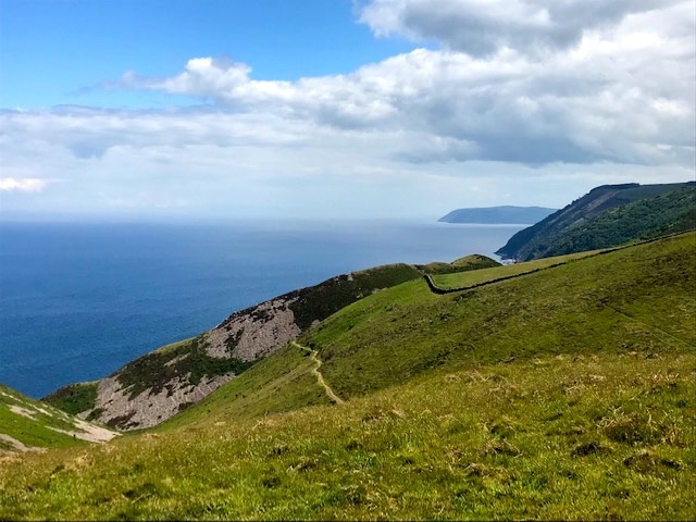 At nearly 1,000 feet this is the highest point on the whole south-west Coastal path, and not to be traversed if you’ve no head for heights. We were blessed with good weather to enjoy fabulous vistas up along the Somerset coast eastward (above) or looking back along the Devon coast westward (below) while across the Bristol Channel the extensive expanse of South Wales clearly presented itself, from Glamorgan to Pembrokeshire. The imposing mass of Exmoor too looked stunning seen from the television mast on the high point that commands a 360 degree sweep over valleys hills and sea.