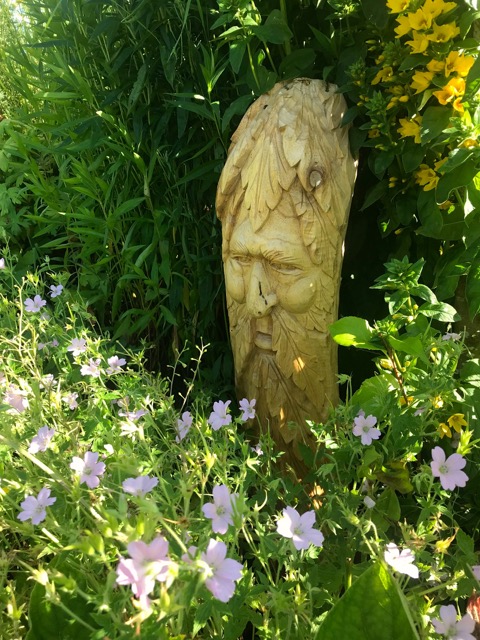 I’ve a soft spot for that recurring symbol of pre Christian paganism, the green man. While walking the main thoroughfare out of Polperro when we were back in Cornwall last month I discovered the workshop of a local woodcarver and bought one of his green man imaginings fashioned from a curving flank of ashwood, to station in our garden back home. Lots of places it could go but for now it has residence in the lush flower and shrub beds of the bank border. I hope it will be happy there, keeping an eye on the landscape.
