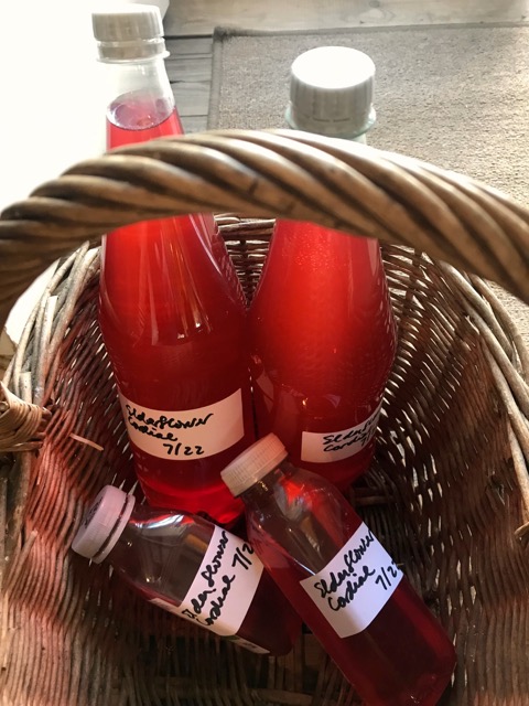I love gathering heads of elderflower from our garden trees for Kim to make cordial. Particularly like the blossoms of our single black elder which yield a beautiful deep pink cordial. Some we’ll have over the coming weeks while the rest (decanted in plastic bottles) goes to the freezer to re-conjure the scent of summer in winter.