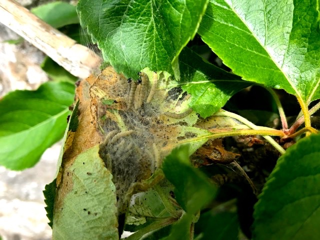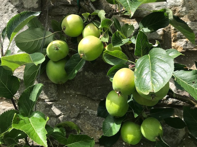 We’ve caterpillar tent moths camping out on the apple fans for the first time this year. Going round removing them whole by hand eased the problem and reduced chances of the caterpillars devastating leaves and buds. All the apple varieties doing well and the fruit beginning to swell. The James Grieve, the oldest established and most productive of the fan varieties on our south facing wall, doing particularly well.