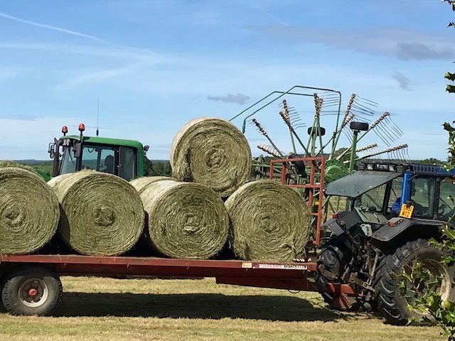 Our neighbouring big meadow was finally cut and turned mid week and on Saturday morning the same contractors returned for part two. First the rowing up with tractor and tedder (machinery that can both spread and ‘row up’ cut hay), soon joined by the tractor with baler and finally a tractor hauled long flat bed trailer makes an appearance with another tractor whose hydraulic forks lift and load the round bales that the baler has just dropped. The whole exercise is fabulously efficient and as skilfully and gracefully executed as a piece of dance theatre.