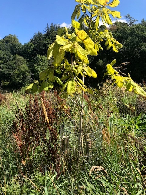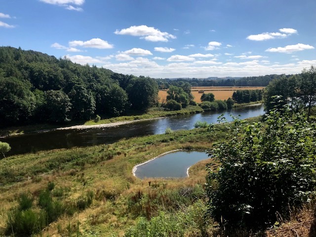 Landowner William Younger has initiated a phased programme of works to clear coniferous plantations and replant with deciduous trees. We saw chestnut (above), rowan, oak, hazel etc. secured by tree guards, surrounded by deer fencing. Those clearances and rides also happen to encourage butterflies to breed and open fine views of the Tweed, one of the country’s best salmon and trout fisheries. There’s a mile and a half’s beat here on the right bank, with eight named pools, good for both high and low water conditions. Anglers who can afford the rates clearly need to be confident casters of line and competent waders in its variable waters.