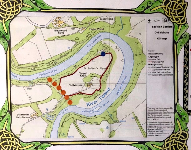 Our second family walk allowed us to discover Old Melrose, a few miles downstream from the current site, situated on a promontory formed by a hairpin bend in the Tweed. This was the land gifted by King Oswald of Northumbria in the 7th Century to missionary monks from Iona, led by St Aiden. That early set of monastery buildings would have been separated from the mainland by an earth bank ditch or vallum. This physically secured the site and acted as a reminder that the monastery was a sacred holy place, separated from the secular world. It would have been treeless then, hence the name ‘Bare Headland’ or ‘Mail Ross’. Aiden inspired Cuthbert to become a monk and eventually he became Prior here. Cuthbert heavenly visions caused him to leave for Lindisfarne where he secure Aiden’s foundation on Holy Island, and where he was initially buried as a revered saint. The modern St Cuthbert’s Way, officially designated as a long distance trail in 1996, retraces the great man’s 62m/100K sojourn.