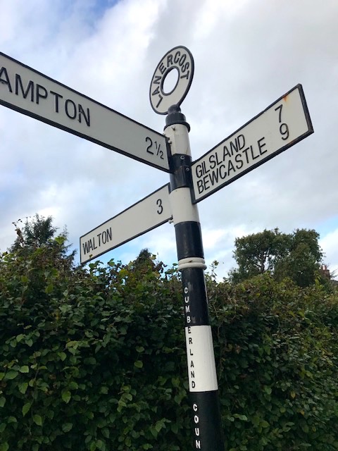 Starting from the car park at Lanercost we ascended out of the sheltered valley on quiet lanes working our way gradually uphill, passing this handsome Cumberland County Council black and white road sign at an intersection.