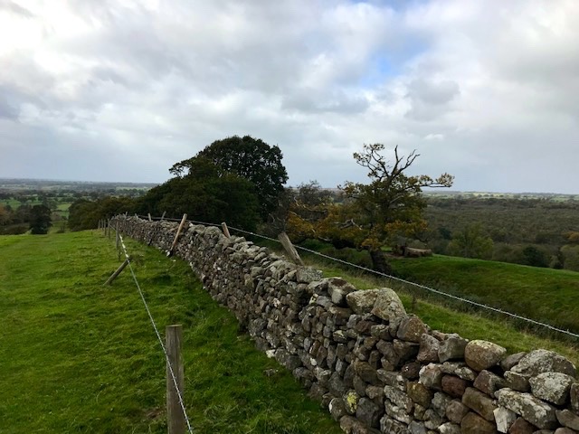 We traversed boggy pastureland and B roads that ascended a ridge, yielding views of far off fells to the south lowering under a leaden sky. Turning off the tarmac, after a few twists and turns, we regained the wall path proper.
