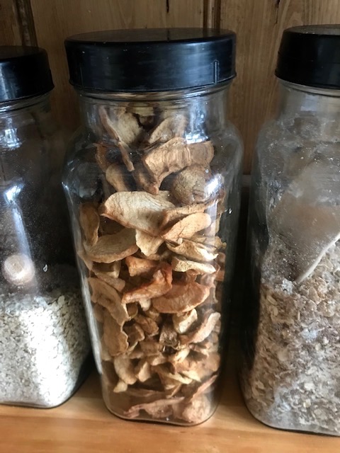 All the apple varieties in the garden – with the exception of Christmas Pippin – have now been gathered in and I’m still processing them as puree or dried fruit for winter use. Old sweet jars, like the one seen here, are great for this. An end of seasonal fare for birds, rodents and slugs to feast on. I witnessed for the first time a crow fly off with a large windfall apple in its beak. The general ingenuity of the corvus family should never be underestimated and I wonder if they’ve developed this technique or learnt it from parents.