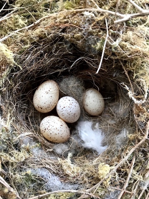 I spend a happy morning re-clipping the string of fairy lights around the upper edging and wooden rafters of the recently rebuilt garden porch. In the process I reach up to feel in the nest that the swallows built this year and discover four perfect little eggs. That second brood only produced one fledgling so these infertile unhatched eggs, measuring some 13 x 20 mm, are a poignant, beautiful reminder of our summer visitors. The photograph shows the clutch in a new setting – an abandoned goldfinch nest I found in the garden, that now sits on a shelf on the porch.