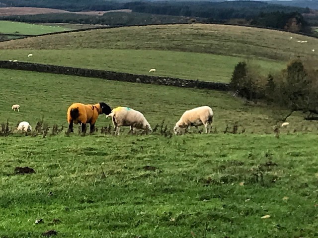A walk up the road brings us to a field where Easterhouse’s Suffolk ram has been harnessed with its chest marker and put to their flock of texels and mule ewes. As the name indicates Suffolk are a lowland breed originating from the county of that name in the south of England, prized for their quick maturing fat lambs. He’s not easy to overlook either, being dyed yellow as a result of the latest farming fad for colouring tups. Suffolks grow their wool short and dense so can take a dose of dye while a long rough staple northern breed like Blackface or Swaledale would prove nigh impossible to colour up in this manner.