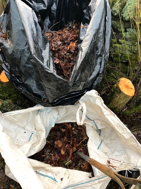 Raked and brushed most of this year’s leaf fall where it had piled up over gravel and grass and shovelled them into an old gravel dumpy bag, and dragged it to my leaf mold pile next to the newly decapitated willow tree. The idea was to first take the two years worth of leaves that had been composting to hummus under its cover and put that on the vegetable boxes. Alas, it was not to be. My fork bit into a fibrous tangled mass of fine roots…the willow had long since beat me to this food source! Lesson learnt I now re-bagged the new leaf crop into a cavernous black plastic bag and sealed it down. That will both warm it, help break the tissue down and most importantly stop the leaves being devoured by the hungry roots.