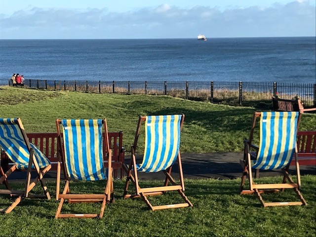 At the other end of the long wide beach we climbed back up, overlooking the old tidal lido, to emerge by the silhoutted remains of castle and priory that dominate the headland here. A clutch of deserted striped deckchairs and varnished benches cluster here with commemorative bunches of flowers strapped to them.