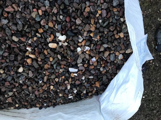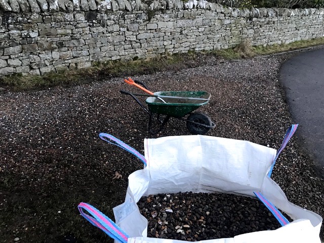 Post waterworks excavations we took delivery of two dumpy bags of gravel to resurface the yard drive entry. The driver showed me the stones before using the hydraulic crane to lift and drop the load. They’ve recently changed suppliers to one that sources its stones from the beach at Seaham on the Durham coast. There is a very small amount of crushed shells amongst the aggregate. (Less than 1% by my calculation) Consequently some very fussy customers have refused to take delivery. Our young driver was bemused as we were. He’d even joked with one such customer that she should look on the bright side and encourage her children to look out for fossils that might be in there too. She was not amused.