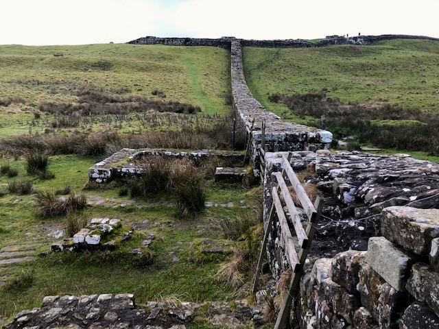 We warmed up gaining and losing height over the first two compact ridges that the wall rides. The huffing and puffing stage before you get into your stride. The wall then leans away northwards with a steep twist down past Kings Wicket, where a permissive path swings back westward along the shallow valley. This was once a rural highway in medieval and Tudor times, mainly for moving stock, and a dangerous one it must have been, here in the heart of lawless Reiver country. A branch of the powerful Armstrong clan set up home in the ruins of the fort at that time, hence the name Housesteads for the place the Romans knew as Vercovicium.