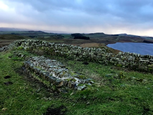 Gale force winds, heavy rain showers becoming hail, breaks of blue in rolling mass of grey cloud, kicked through by legs of light picking out roads, glistening roofs and white highlighting far horizons of wind turbines. Just the weather for a post Christmas family outing along Hadrian’s Wall.