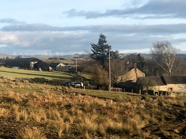 Weaving through a housing estate on the edge of the big village which is the dale’s main settlement, well supplied with local shops and facilities, we gently ascended a metalled track to reach an old farmhouse and outbuildings. Looking back the horizon hugging wind farm looked closer than it is, revolving arms reflecting low afternoon sun against a dark sky.