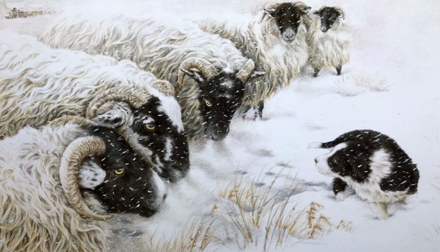 In the wake of near constant rain the ground was soaked and had been widely poached into thick mud by the feet of hundreds of sheep crammed around ring feeders and low loaders where bales of hay had been dropped. A large mixed flock of Blackies and Swales watched our progress with cautious curiosity as we passed through the old quarry with its clitter of abandoned rock, then along the deeply rutted puddled track where generations of carts, tractors and quads had passed. Kim set a number of scenes on this exposed moorland with sheep and border collies in action mode. Like this snow scene with the escaped puppy in ‘Just Like Floss.’