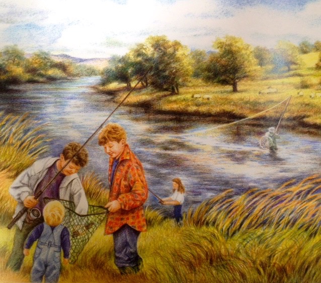 A bend in the wide river revealed a local bathing and swimming stretch, a scene captured in illustrations for ‘One Summer’s Day’.