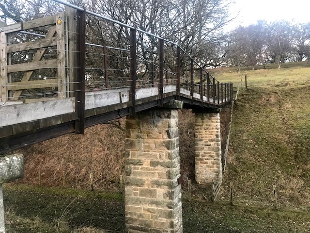 Immediately below the trees lies the trackbed of the former Border Railway, following the valley contour, cutting clean and deep across our downward path. Here a fine old footbridge has been restored and is maintained by National Park volunteer rangers, allowing walkers to cross in style from bank to bank.