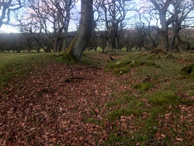We descended to pick up a small stream, passing a couple of sheep carcasses picked clean by predators, then through a gate into a field which contains an old oak wood. This covers the site of a Romano-British settlement, at least 1800 years old, consisting of at least four round huts and subsidiary stock pens within an outer ditch and bank. These typical features remain as faintly delineated earthworks and were the subject of a university excavation in 1958 that established the steading’s lay out and structure and lead to its eventual listing in 1973, over a decade before Flea and Kim took on the farm.