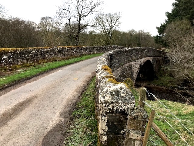 The track joined the public highway where we turned back to cross, in turn, both branches of the exuberant young river. Curious to note the long extended stone walled parapets of the bridge. Indicated to us this design must act as a barrier to the road getting flooded.