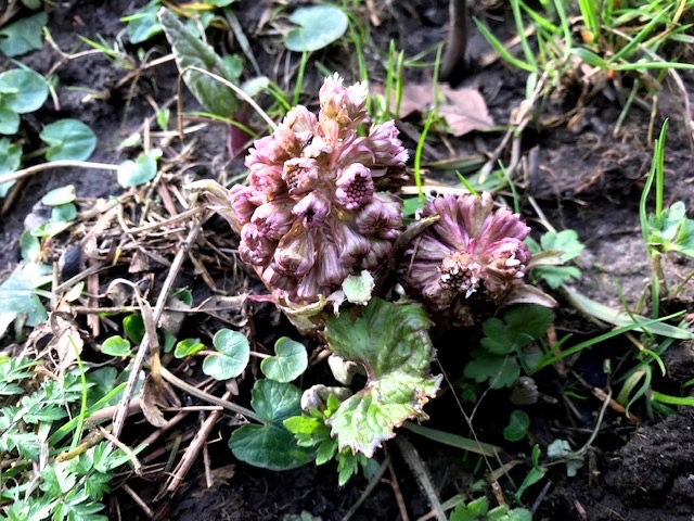 Now back on a concrete access track we could see through the bare trees where the two feeder branches of the River Lyne – termed white and black – converge. A lifebelt indicated a swimming spot in the newly widened waterway. I smiled to see a butterbur, which so loves damp spots, poking its purple coloured flower heads above the soft ground.