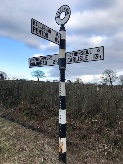 At the incline’s T Junction another fine old Cumberland County Council road sign greeted the eye. Turning right here on the home stretch brought us along what must once have been a drove road. It ran long and straight with wide verges for cattle to graze as they made their journey from the borders to markets in Carlisle or Penrith. We passed on our left an old building which was once a pub, where drovers and countrymen could slake their thirst, but is now a private house.